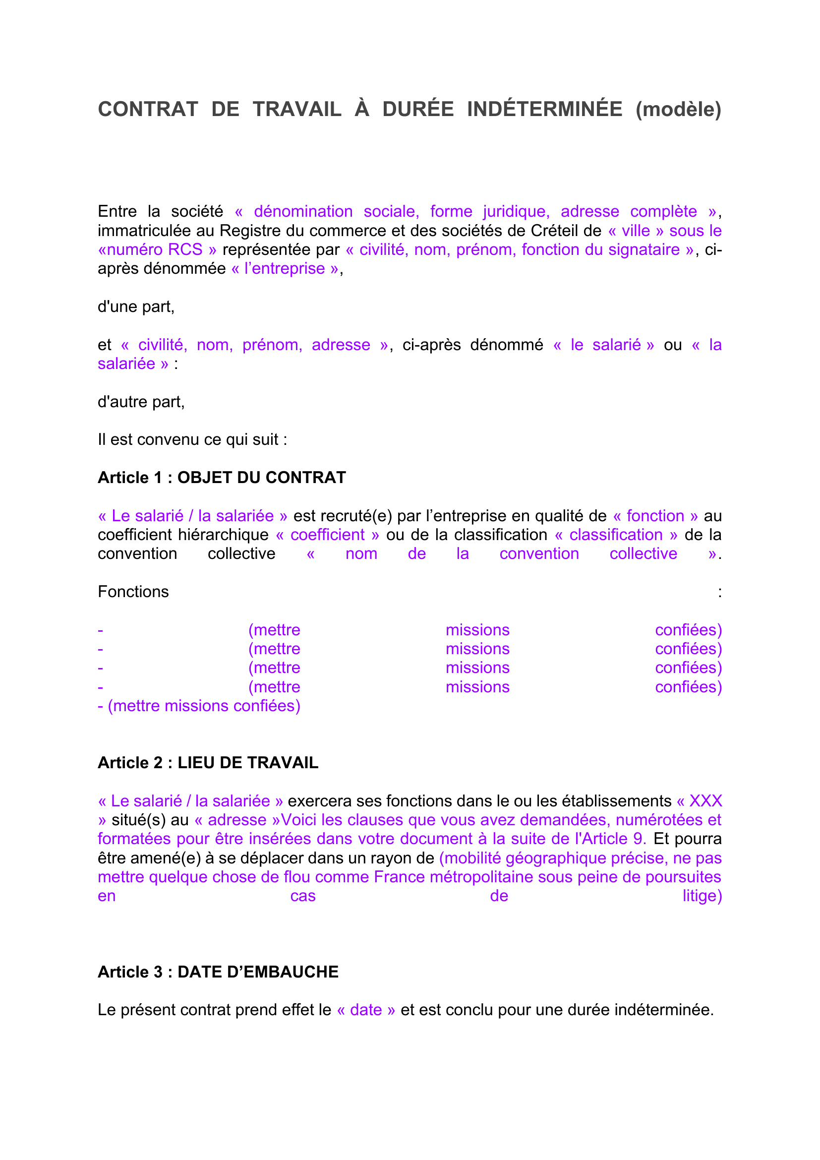 Le CDI est la norme. Pour être valide et protéger l'employeur, il doit contenir a minima :